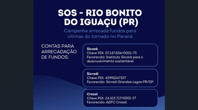 Uma campanha solidária está arrecadando doações para as vítimas do tornado que atingiu Rio Bonito do Iguaçu, no Paraná. Você pode ajudar fazendo um PIX para uma das seguintes contas de cooperativas de crédito: